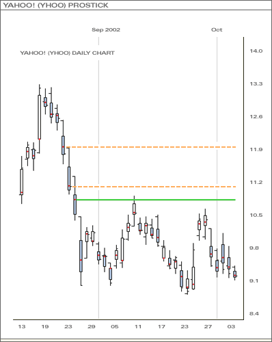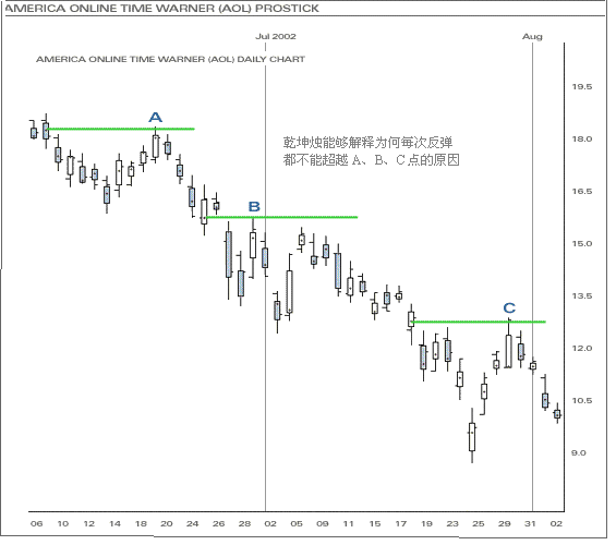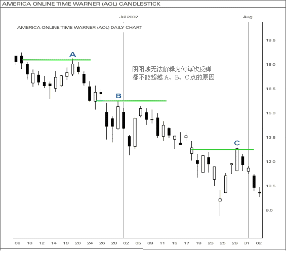 上图为一向淡的走势图。股价持续下跌形成下降轨,其後,出现多次反弹。如使用阴阳烛来分析,投资者无法知道为何每次反弹都不能超越A、B、C点的原因。