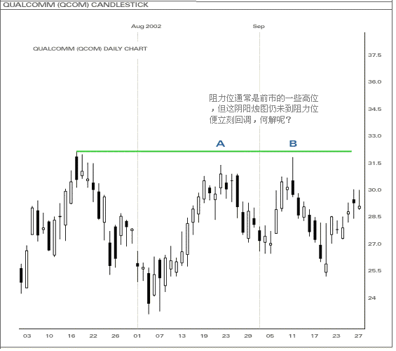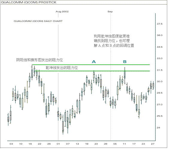 传统图表往往利用前市的最高价作阻力位(如上图),投资者还未及理解A、B点,价位便开始回落。然而,利用乾坤烛测市,所有阻力位跃於纸上,有效地掌握後市形势。