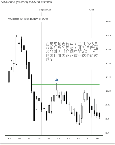 叁只乌鸦是一种利淡後市走势的形态,能形成一个强而有力的阻力位(如图中的A点)。但此阻力位应如何界定呢?透过乾坤烛,此问题即迎刃而解。