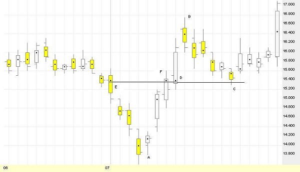 to fall below even the low of bar D, the last rising bar