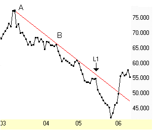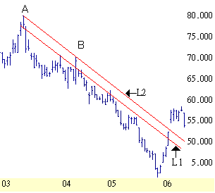 instead of the closing prices as in a Line chart. As can be seen, a resistance line L1